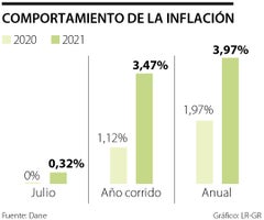 La variación anual (julio 2020-julio 2021) de la inflación fue 3,97%%, es decir, 2 puntos porcentuales más alta que la reportada en el mismo periodo del año anterior, cuando fue de 1,97%.