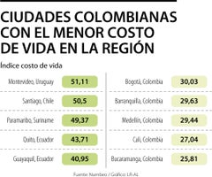 La base de datos del portal Numbeo, que recopila y compara los precios a nivel mundial de los costos de vida, los precios de la canasta básica, transporte y demás factores, mostró en su actualización de mitad de año que, en Suramérica, las ciudades colombianas son las baratas para vivir.
