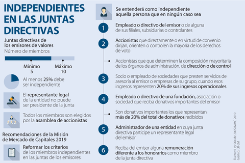 La Ley 964 de 2005 establece que las juntas de los emisores deben estar compuestas por mínimo cinco y máximo 10 personas, de las cuales al menos 25% debe ser independiente. Además, en su artículo 44, señala los seis criterios que no permiten que alguien sea considerado como tal.