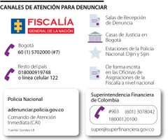 Muchas personas acuden a la Superintendencia Financiera de Colombia (SFC) para denunciar y, aunque el regulador recibirá la reclamación, será tomada como una queja y no como una denuncia. El único ente autorizado para hacer la debida investigación del caso es la Fiscalía General de la Nación, por lo que se puede hacer la denuncia directamente con la entidad o en la Policía Nacional.