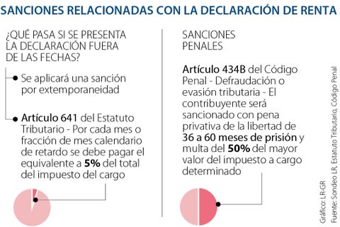 Si por el contrario los contribuyentes no declaran el impuesto de renta, estarán expuestos a una multa de 20% del valor de las consignaciones bancarias o ingresos brutos que estos tengan. En un segundo caso, deberá pagarse el 20% respecto a los ingresos brutos que figuren en la última declaración. Además, la no declaración trae consigo consecuencias en materia penal y los evasores podrían enfrentar penas de hasta 108 meses de prisión, medidas que pueden ser fortalecidas en el marco de la reforma tributaria.