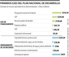 El eje que recibirá más recursos será el de seguridad humana y justicia social, con $743,7 billones. Le siguen convergencia regional ($138 billones), internacionalización ($114 billones) y estabilidad macroeconómica ($83,4 billones). El derecho humano a la alimentación recibirá $46,1 billones y Ordenamiento del territorio alrededor del agua y justicia ambiental $28,8 billones.