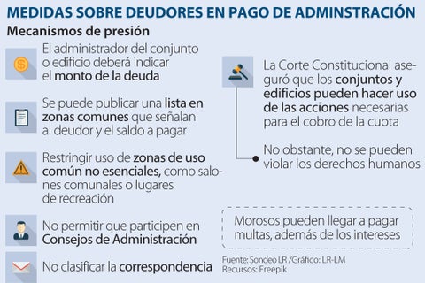 En caso contrario, se puede presionar al moroso publicando una lista en lugares de alta circulación con la infracción que está cometiendo. Además, se le puede prohibir el uso de zonas comunes no esenciales (salón comunal o lugares de recreación) hasta que salde la cuota.