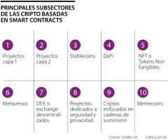 El segundo grupo tiene que ver con los smart contracts o contratos inteligentes, que nacieron a partir de 2014 y que tienen cerca de 100 sectores, según la clasificación de portales como CoinMarketCap o CoinGecko. Por ello, LR le explica las 10 principales formas de sectorizar este grupo de criptoactivos.