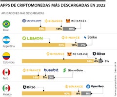 El primero en la lista es Brasil, en el que se han descargado 7,2 millones de aplicaciones dedicadas a este fin, seguido de Argentina, con 2,4 millones de descargas, mientras que en Colombia se han bajado 1,2 millones de apps de criptomonedas.