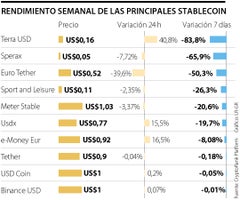 Sin embargo, en lo que fue la peor semana para la historia de las criptomonedas, las stablecoins también sufrieron. En términos de capitalización, las divisas digitales borraron alrededor de US$700.000 millones su valor de mercado, según el índice Bloomberg Galaxy Crypto, que se desplomó 35%.